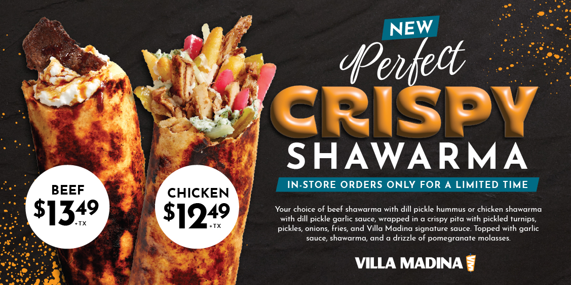 Crunch into the new Crispy Shawarma Wraps, wrapped to perfection. Choose beef shawarma with dill pickle hummus or chicken shawarma with dill pickle garlic sauce, tucked into a crispy pita with pickled turnips, pickles, onions, fries, and Villa Madina signature sauce. Finished with garlic drizzle and pomegranate molasses. Try one today. Bold flavour and irresistible crunch in every bite guaranteed. β¨Only here for limited time. Starting at $12.49. π Available for walk-in/in-store at participating locations