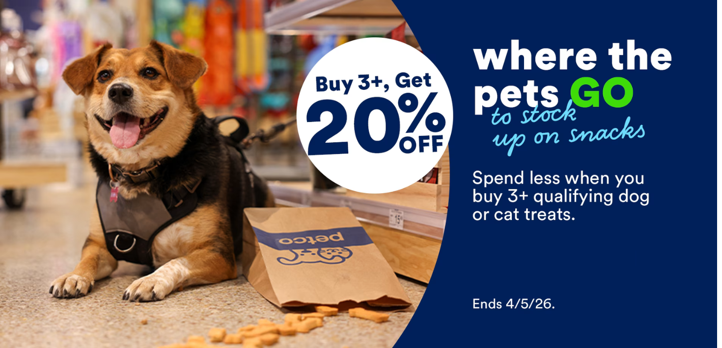 Qualifying dog or cat treats. Exclusions apply.Only at participating locations.